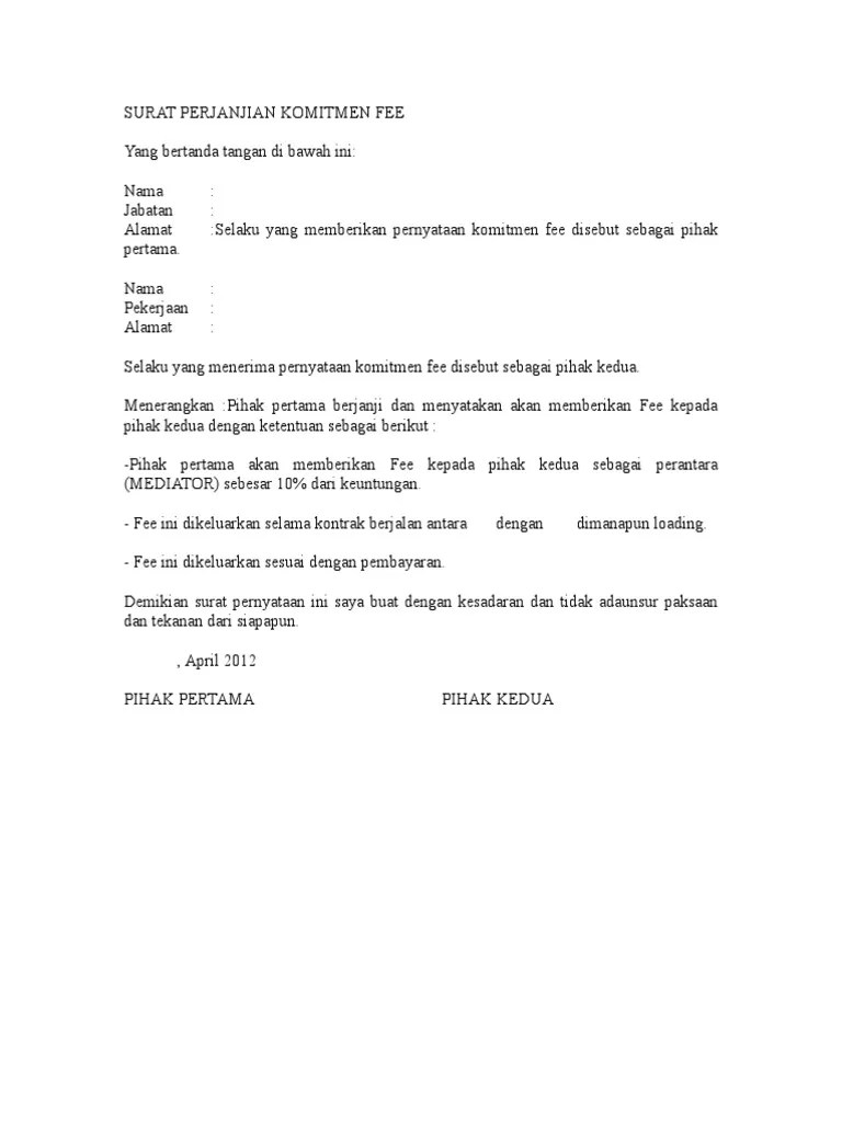 Jika iya, berikut ini adalah contoh surat perjanjian jual beli rumah yang bisa di download. Sudah tentu perlu mempersiapkan surat perjanjian kesepakatan properti. Surat perjanjian komitmen fee yang bertanda tangan di bawah ini. Contoh surat perjanjian fee mediator batubara adalah gambar contoh. Pemerintah desa sebesar 1/1000 (satu per seribu) dari nilai perjanjian.